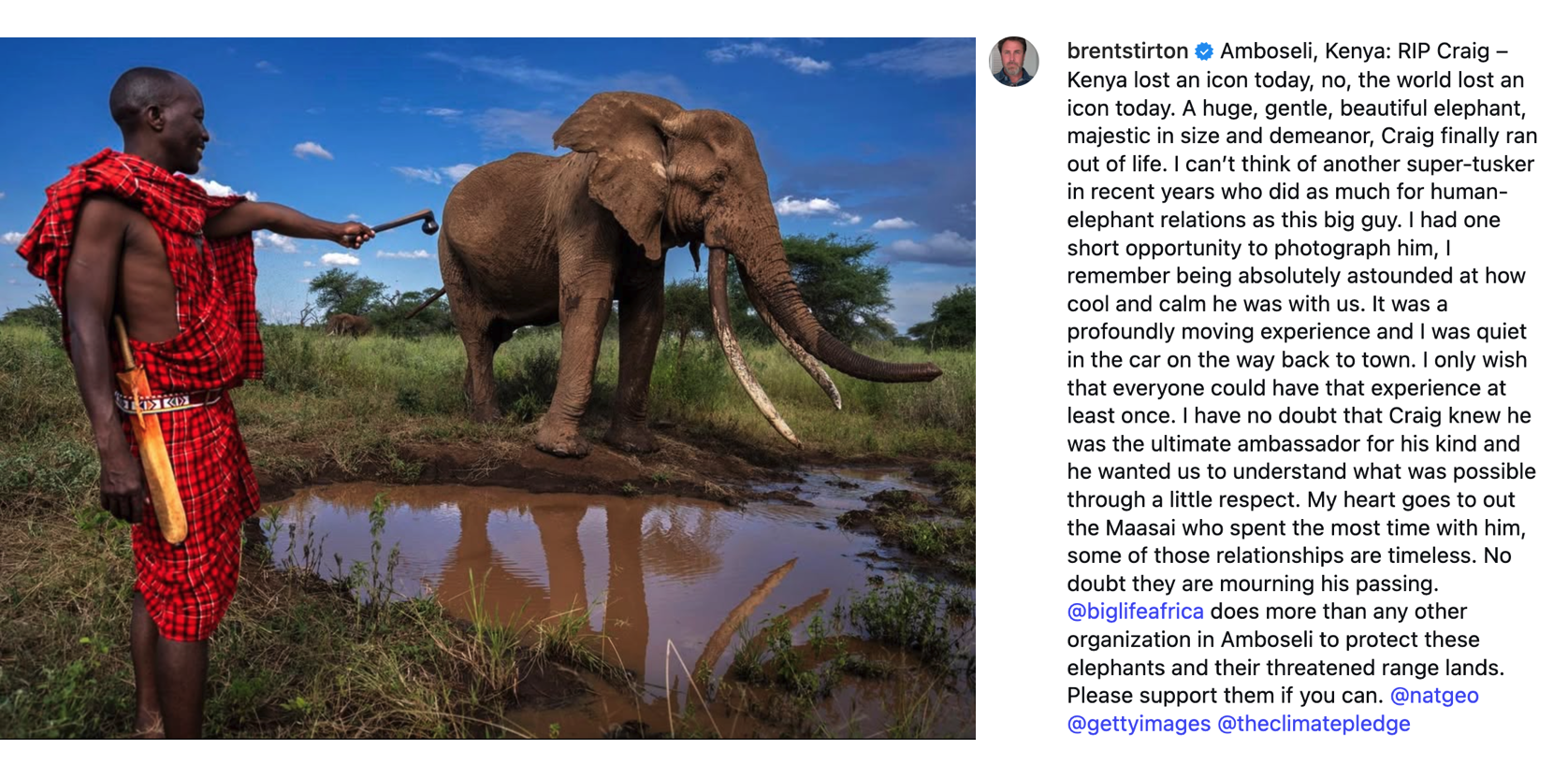 On Instagram, photographer Brent Stirton posted a tribute to Craig, a legendary bull elephant he photographed in 2024.