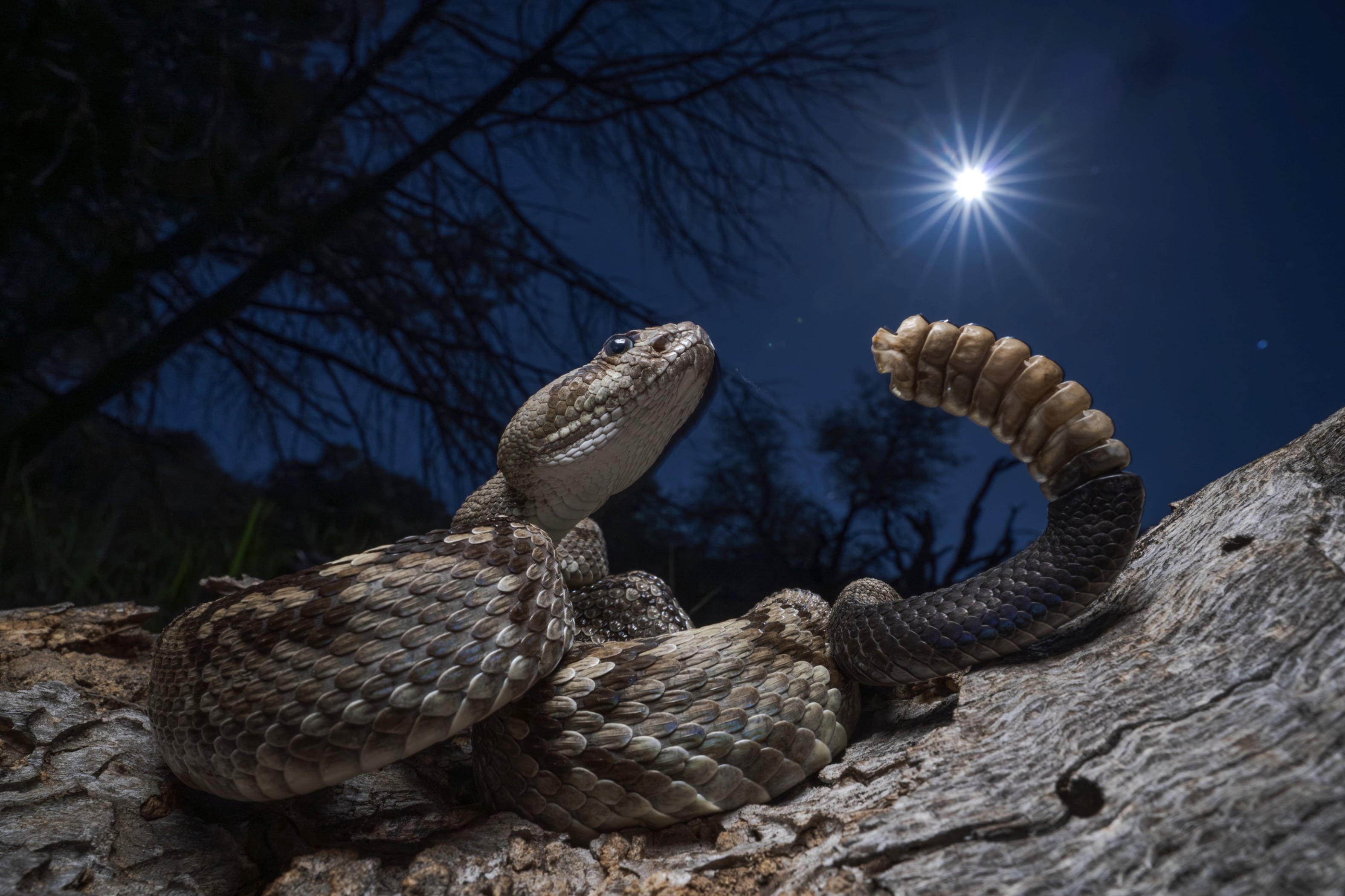 An eastern blacktailed rattlesnake curls on top of a log after a driver moved it from the road. This is one of several images that won Aznar Wildlife Photographer of the Year’s 2025 photojournalist story award. (Javier Aznar González de Rueda)